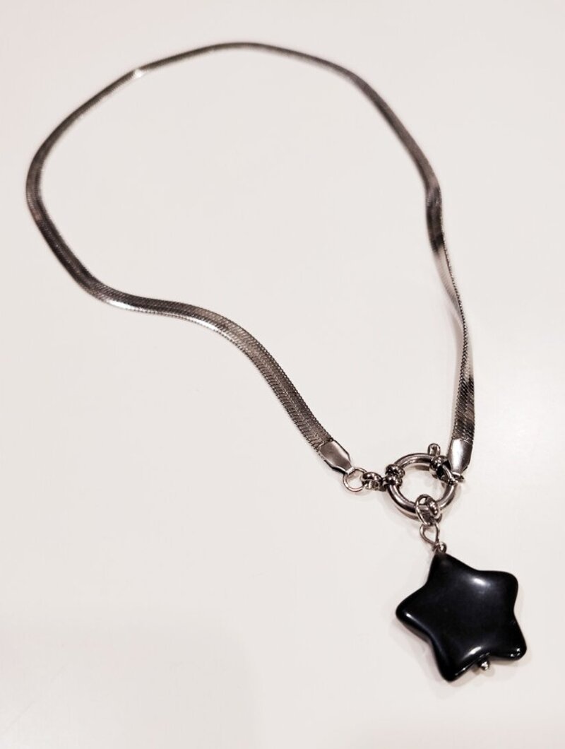 Collana in acciaio modello snake piatta con moschettone a molla e pendente stella in ossidiana