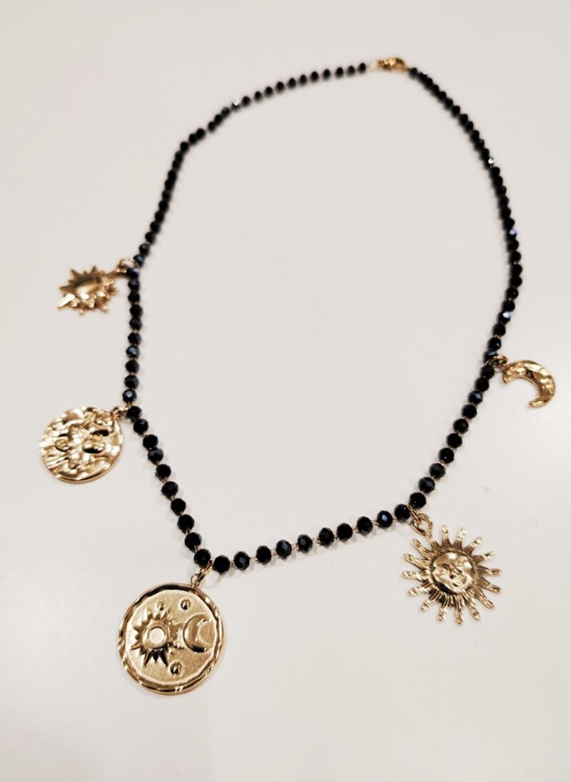 Collana in acciaio dorato con cristalli neri effetto specchiato e charms